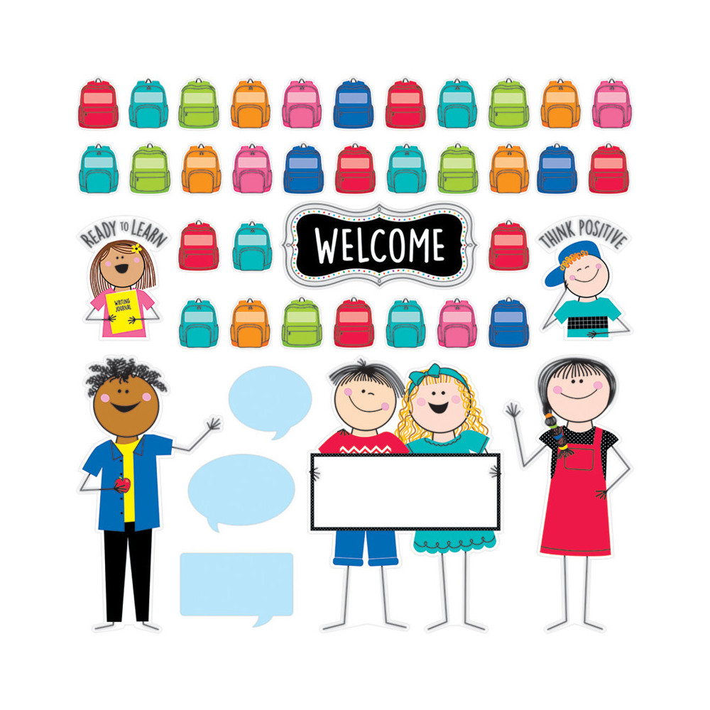 This All Are Welcome Bulletin Board is designed to set an inclusive tone wherever it's displayed. The set features Stick Kids representing diverse backgrounds and includes a colorful array of backpacks that can be personalized for the members of your class or group.
