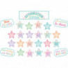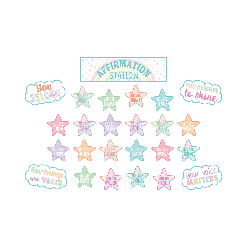 Your students will feel valued with these eye-catching visual reminders in soothing pastel colors. Includes 4 positive sayings and 20 positive affirmation stars. The "Affirmation Station" title piece measures 21" x 6". 25 total pieces.