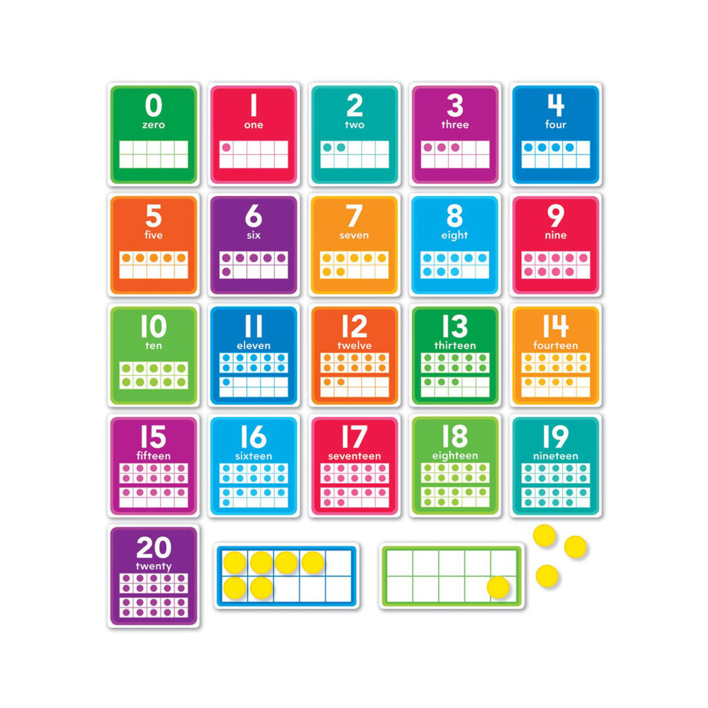 Help children learn numbers 0-20 with this colorful bulletin board set. Each number is presented as a numeral, in word form, and on a 10 frame. Includes two blank 10 frames and 20 counters for hands-on practice.