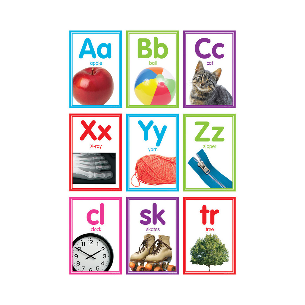 Each alphabet card shows the letter in upper- and lowercase as well as a real photo of an object that starts with that letter and the word for that object spelled out. The 14 blends cards include the blend, a photo of an object that starts with that blend, and the word spelled out with the blend underlined to help reinforce language development skills. Each card measures 5-3/4" x 8-1/2". 40 total pieces.