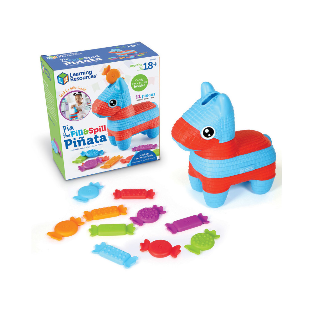 It's a fine motor fun fiesta every time you play with Pia! Whether they're learning preschool fine motor skills at home or in the classroom, toddlers build the whole-hand skills they need every time they play with Pia the Fill & Spill Piñata from Learning Resources! This adorable fine motor toy for toddlers comes with 10 colorful numbered candies that make it easy for toddlers to build counting and color skills, as well as hand strength, coordination, and other essentials of preschool fine motor skills. Here's one of Pia's fun toddler activities—drop the candies in the slot on Pia's back, then open her bottom hatch and let them all spill out! Pia also comes with other fun learning surprises—explore her unique textures and candy for fun tactile and sensory play. Made from durable, wipe-clean plastic, this top toddler toy is ready for years of learning fun. She even doubles as a therapy toy for toddlers! When the fine motor fun is done for the day, Pia's candies store inside for easy clean-up!