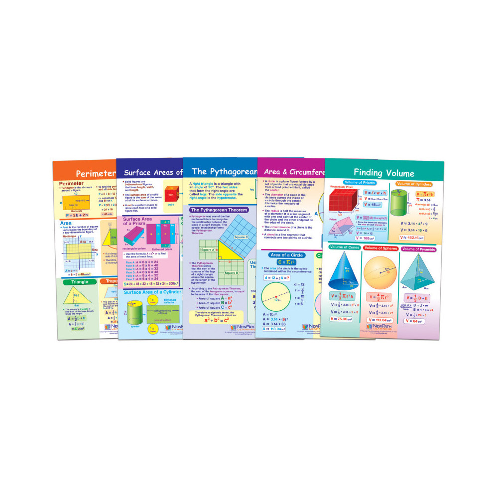 Features a collection of separate posters, each covering a separate, curriculum topic. Uniquely designed, while one side can be posted for student reference, the reverse features dry-erase activities perfect for individual student review or as a learning center activities! Graphic images and hands-on activities combine to provide comprehensive coverage of essential student skills and cover the current state and national standards — including Common Core! Each 12" x 18" Chart is laminated and double-sided — Side 1 features a graphic overview of the topic and Side 2 provides "write-on/wipe-off" activities. Covers Perimeter & Area; Finding Volume; Surface Area of Solid Figures; Area & Circumference of Circles; and The Pythagorean Theorem.