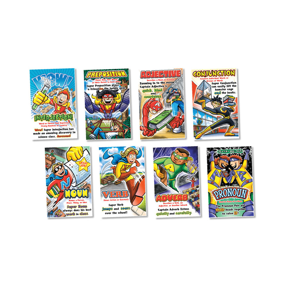 These superheroes make learning parts of speech dramatic and exciting! Each colorful 11" x 17" (27.9 x 43.2 cm) poster features a clear definition and an example. Includes a four-page teacher guide with reproducibles. 8 pieces.
