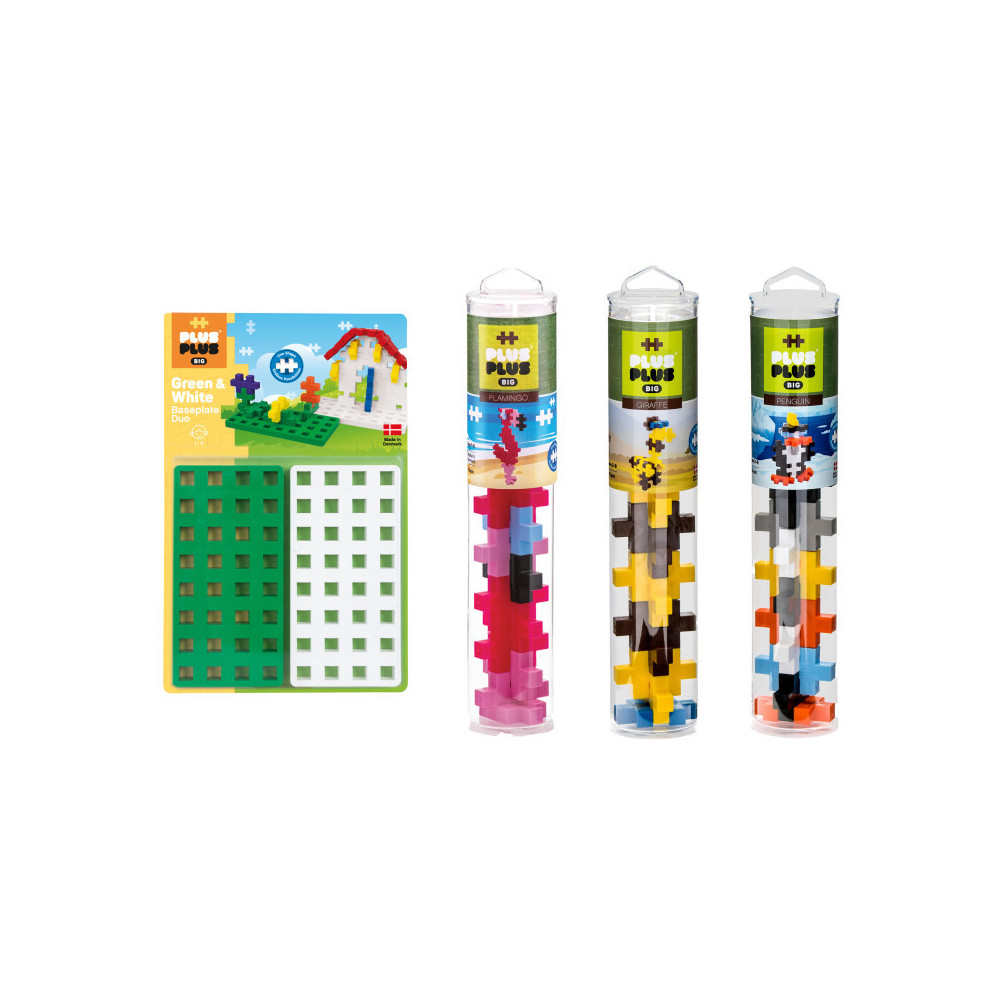 The BIG size is perfect for smaller hands or bigger ideas. This playset includes (3) 15-piece BIG tubes to build a Penguin, Giraffe, and Flamingo as well as a Green & White BIG baseplate duo.