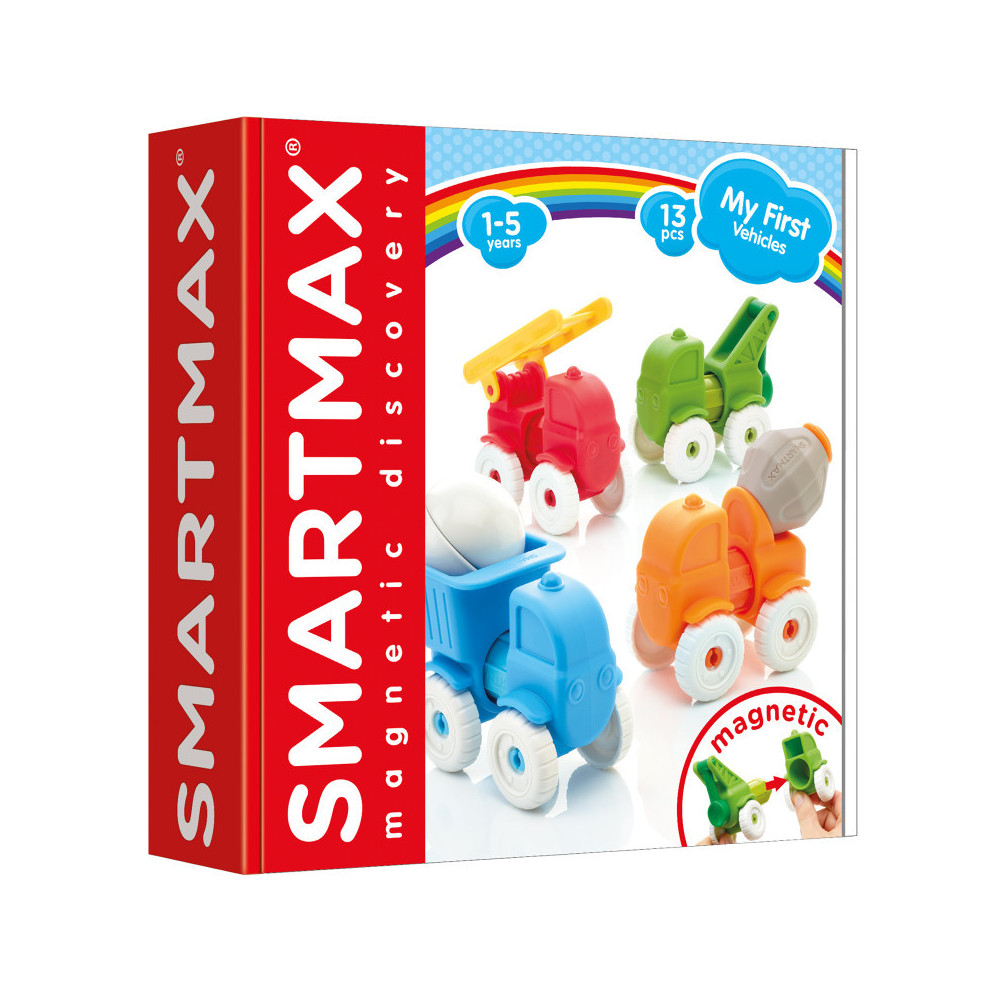 Young children (12+ months) can safely discover the magic of magnetism with the SMARTMAX® "My First" collection. My First Vehicles includes 13 pieces that are building blocks to create 4 different trucks. When clicked together the trucks move on their wheels, resulting in a true creative and sensory experience. The materials used are soft and friendly to little have, while the magnetic bars are strong and safe.