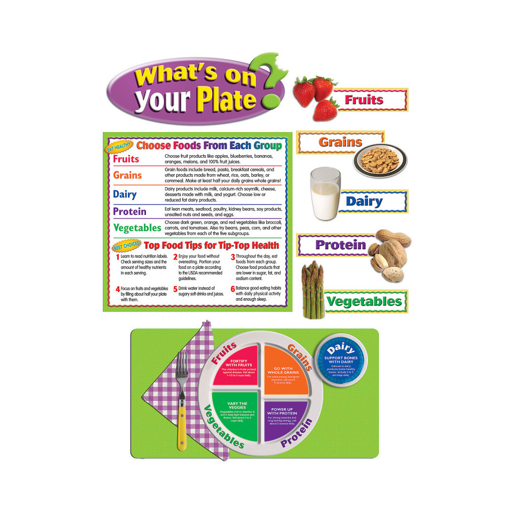 Encourage healthy eating habits by learning about food groups, nutrients, and portion sizes based on the "MyPlate" guidelines from the USDA. The largest piece is 24.5" x 13". Includes a chart of Top Food Tips for Tip-Top Health, 36 photos of food, and a teacher's guide. 47 total pieces.