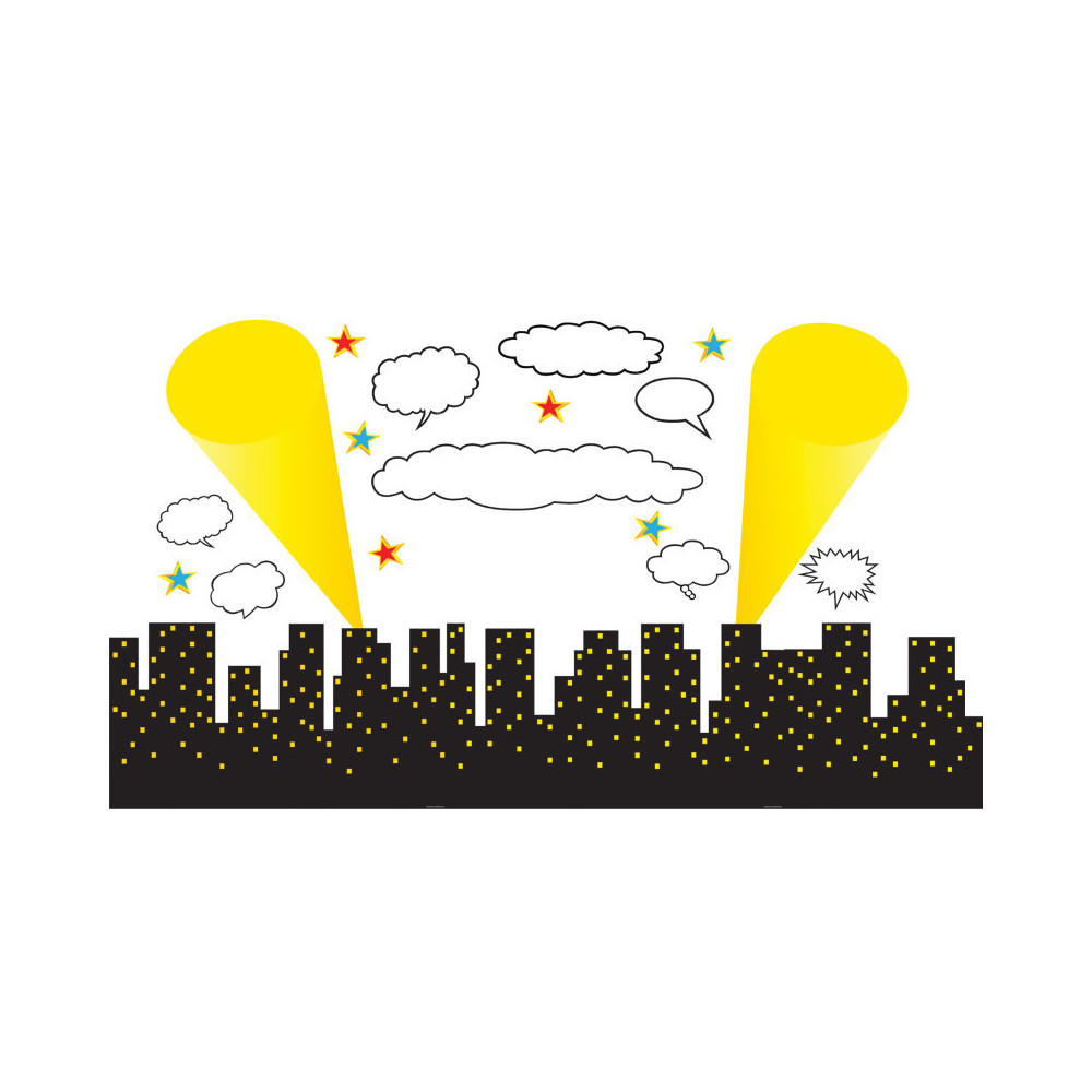 You'll be the superhero when your students see this impressive cityscape scene in your classroom. Each of the 4 building panels is about 24" x 13" and span approximately 8 feet wide when fully assembled. The two spotlight pieces are 2 feet tall. 26 total pieces.