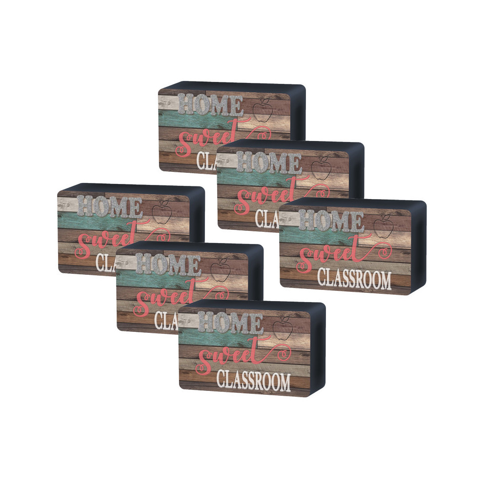 The Home Sweet Classroom Magnetic Whiteboard Eraser sticks to your magnetic whiteboard. Embossed lettering makes the text pop! Measures approximately 4" x 2-1/2" x 7/8". Sold as a pack of 6 erasers.