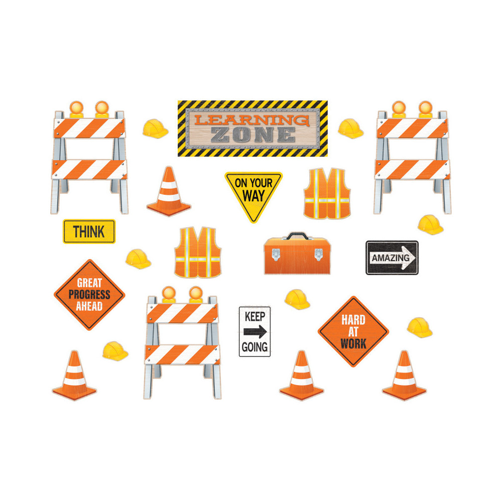 Your crew will love the positive messages and encouraging signs in this construction themed display. Includes 1 "LEARNING ZONE" header piece, 6 signs, 3 construction barriers with 6 matching lights, 4 traffic cones, 2 safety vests, 1 toolbox, and 37 hard hats. Barriers with lights on top measure 12½" x 18½". 60 total pieces.