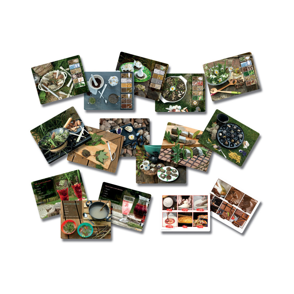 Inspire children to get creative in the mud kitchen! With lots of muddy recipes to choose from, including a Gruffalo stew, seafood platter, and the classic mud pie, children will be eager to get mixing, blending, baking and creating! Each card includes beautiful photographic images on one side with activity prompts, vocabulary and extension ideas on the reverse. Made from durable plastic, any muddy splashes can be easily washed away. Each set includes 16 double-sided cards measuring 8" x 11". Age 3+.