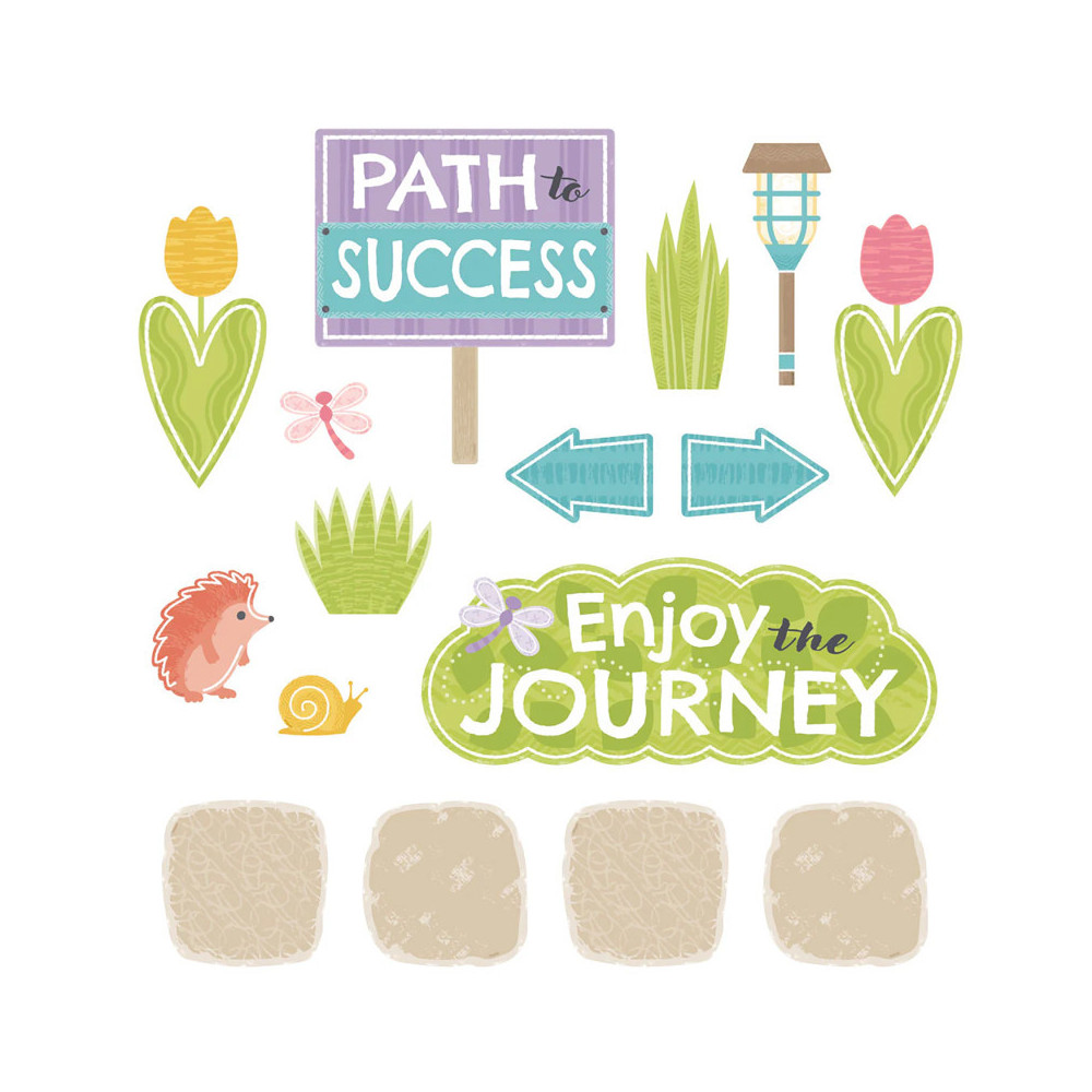 Lay out a path to success! Inspire goal setting and progress tracking with this engaging display set. Walk the Journey to 100 days of school, or track growth toward a reading challenge, fundraising goal, or reward. There are endless ways to display your garden path using all the stones or just a few at a time. Add colorful critters to establish milestones, relay messages, and set the scene. Nature-inspired colors and textures make this set fun for decorating classrooms as well as playrooms, libraries, community spaces, and hospitals. 45 pieces including 20 stepping stones, garden bench (16" wide), 6 plants and flowers, 9 critters, 3 path lights, and 6 pathway signs. Printed with vivid, fade-resistant inks on durable paper stock. Resealable storage bag included. Made in USA.